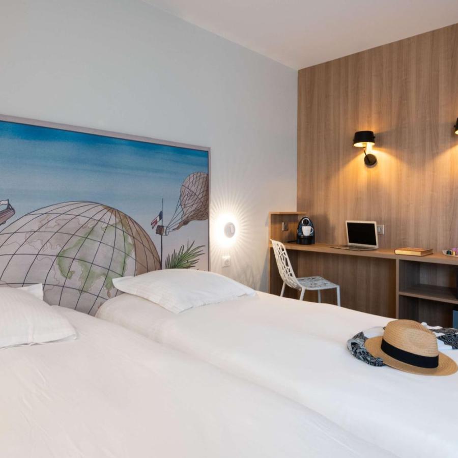 Im Herzen von Biarritz verkörpert das Hôtel Jules Verne ein Erlebnis, bei dem Gastfreundschaft auf Fantasie trifft. Dieses Vier-Sterne-Hotel, das 2021 komplett renoviert wurde, ist eine lebendige Hommage an den berühmten Schriftsteller der Außergewöhnlichen Reisen. Mit seiner sorgfältigen Dekoration, inspiriert von den Erzählungen von Jules Verne, entführt es seine Gäste in eine Welt, in der jedes Detail das Meer, wissenschaftliche Erkundungen und faszinierende Landschaften evoziert. Die 77 Zimmer des Hotels, verteilt auf drei Etagen, sind eine wahre Hommage an die Meisterwerke des Autors. Jeder Raum erzählt eine Geschichte, von den maritimen Erzählungen aus Zwanzigtausend Meilen unter dem Meer bis zu den Luftabenteuern aus Fünf Wochen im Ballon. Die Kopfenden der Betten, die bullaugenförmigen Spiegel und die hier und da angebrachten Zitate schaffen eine einzigartige Atmosphäre, perfekt zum Entfliehen.